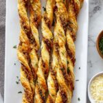 Crispy, golden puff pastry cheese straws flavored with paprika, Italian seasoning, and parmesan cheese, perfect for a savory snack or appetizer.