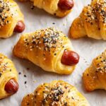 - Brush and Season: Arrange the rolled sausages on the parchment-lined baking sheet with the point-side down, spacing them about 1 inch apart. Brush the surface and sides of each dough piece with the whisked egg. Sprinkle everything bagel seasoning on top if using.